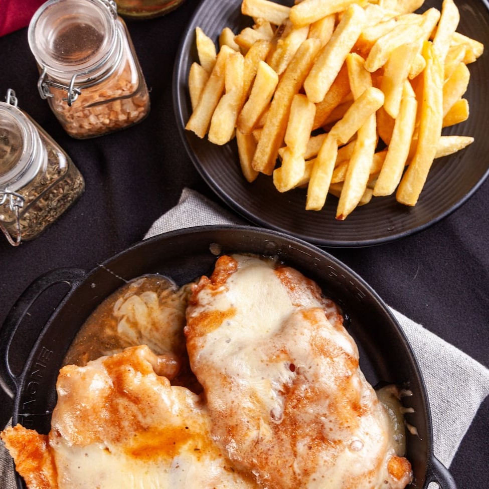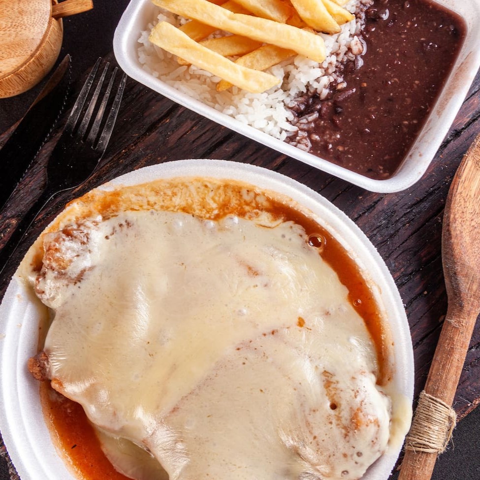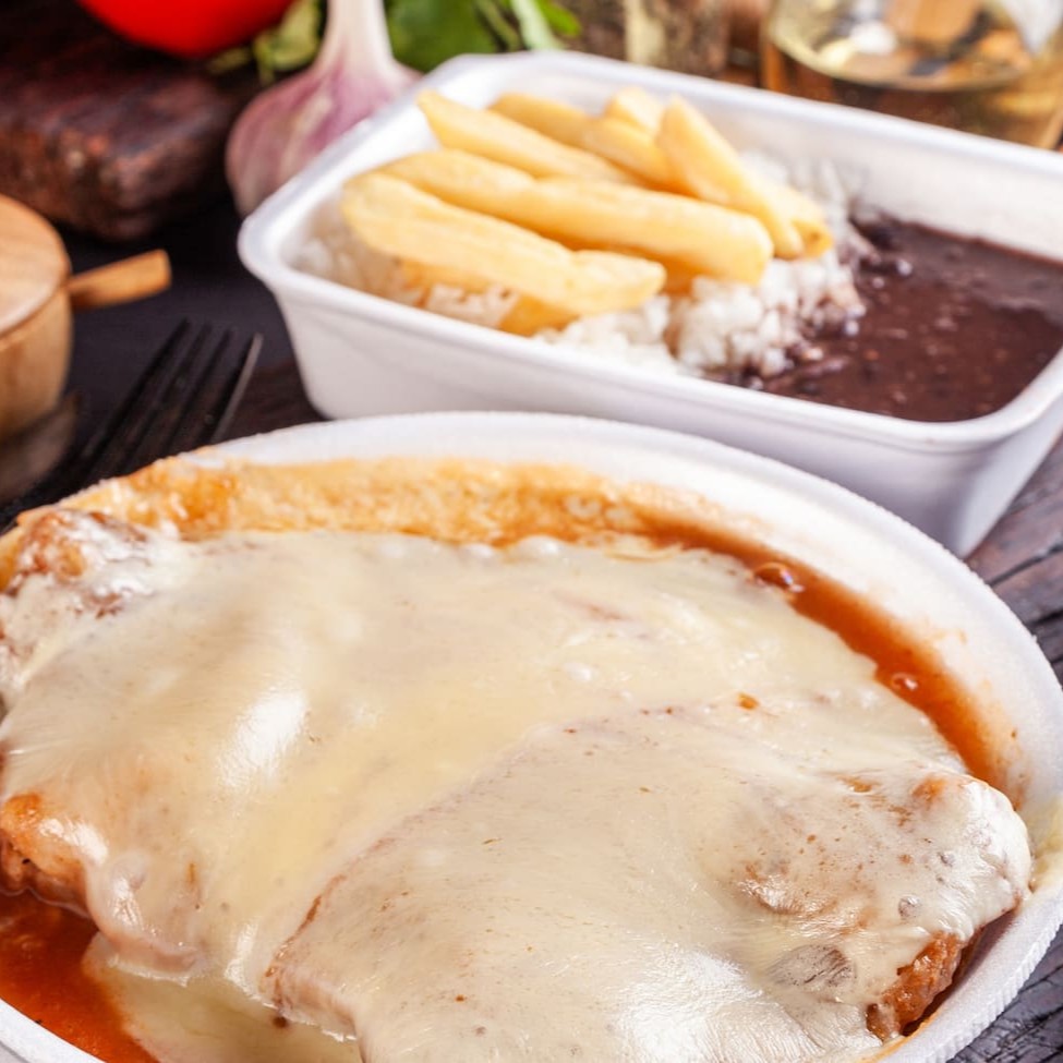 Simples, gostoso e brasileiro. Vem com (100g ) Bife Suino deliciosamente empanados e coberto com muito queijo e servidos junto com arroz, feijão bem temperado, 1 acompanhamento a sua escolha. Não fica só na vontade não.