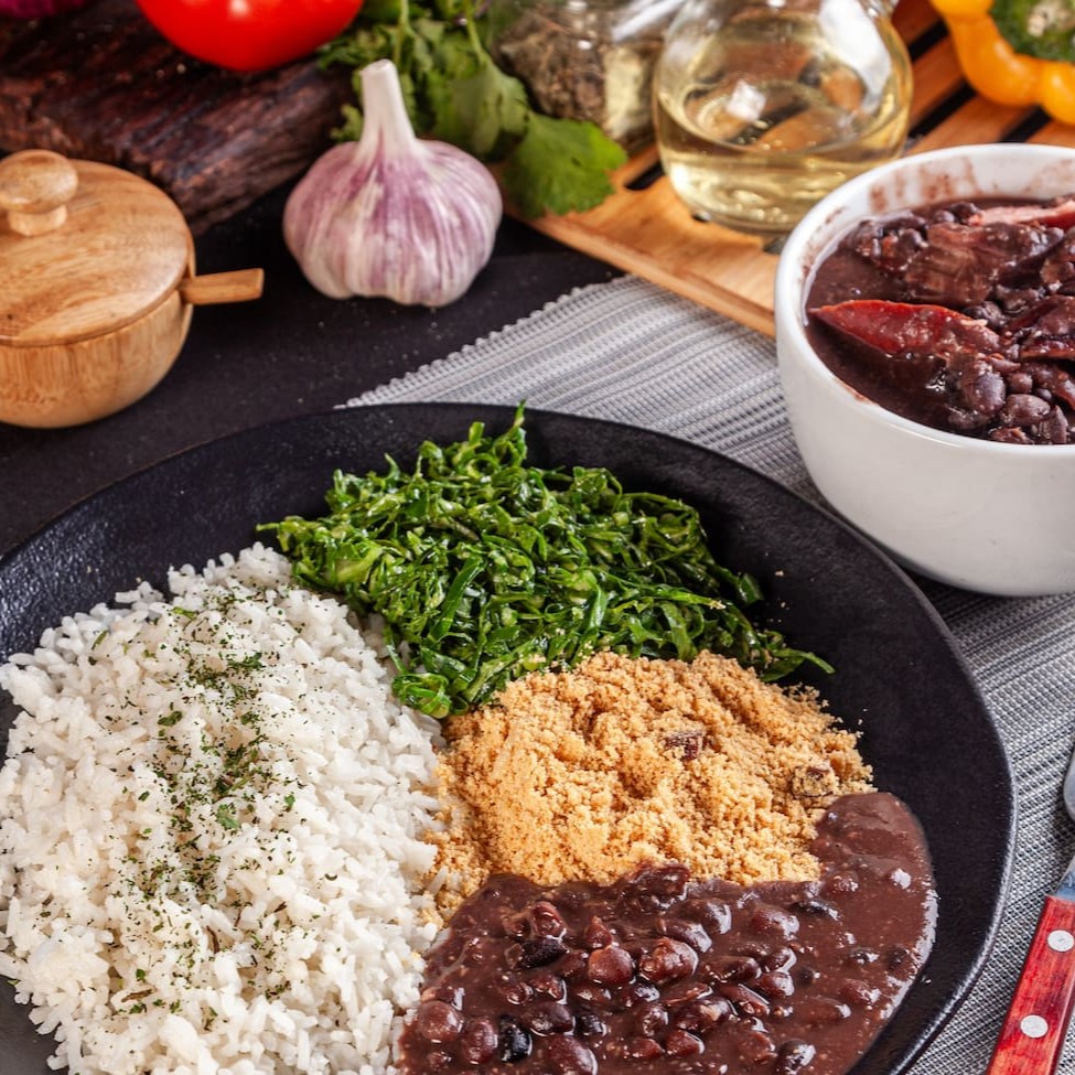 Arroz, feijão farofa e couve /( carne seca ,lombo, costela e linguiça.)