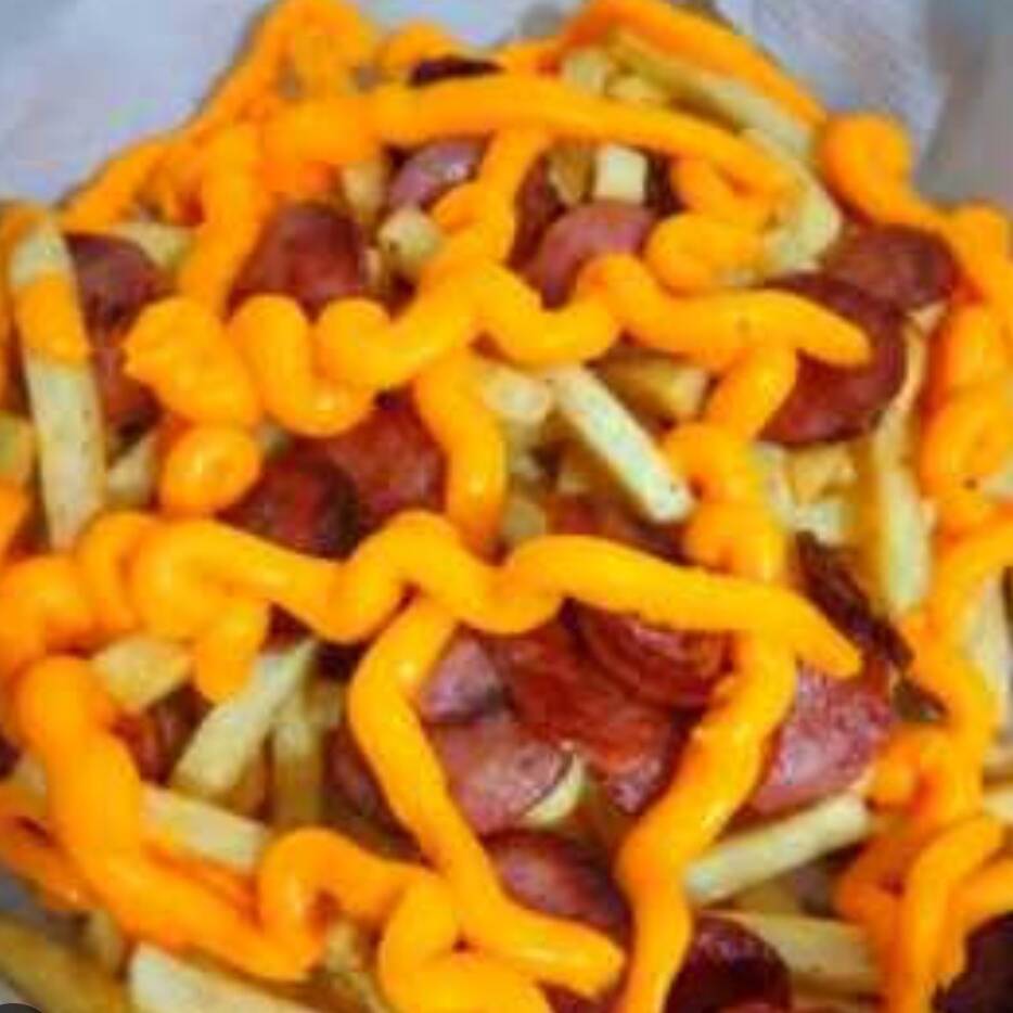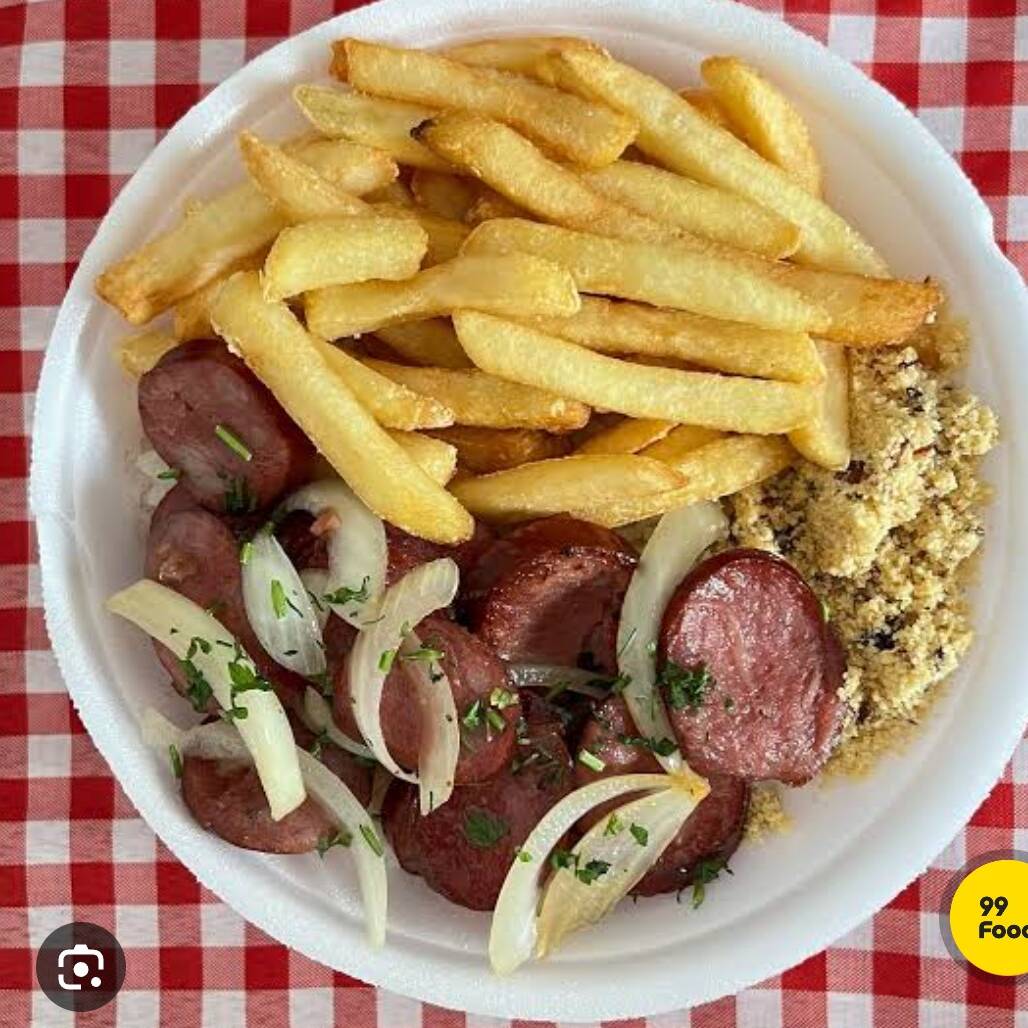 Linguiça calabresa, arroz, feijão, macarrão, farofa mais um (complemento)