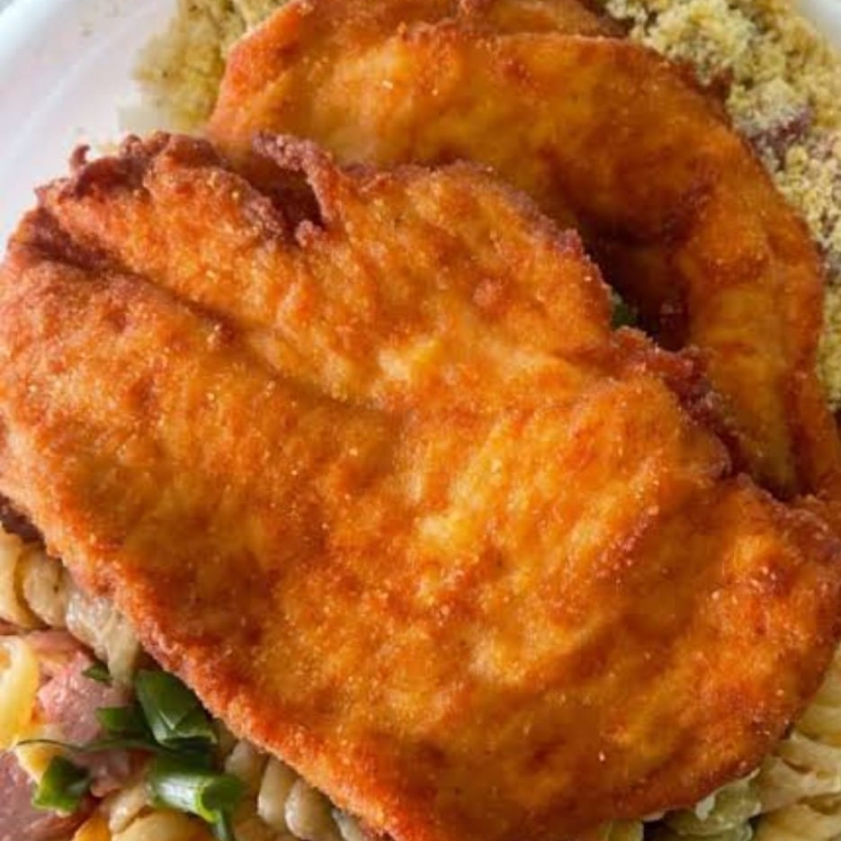 Frango A milanesa, arroz, feijão, macarrão, farofa e mais um (acompanhanto)