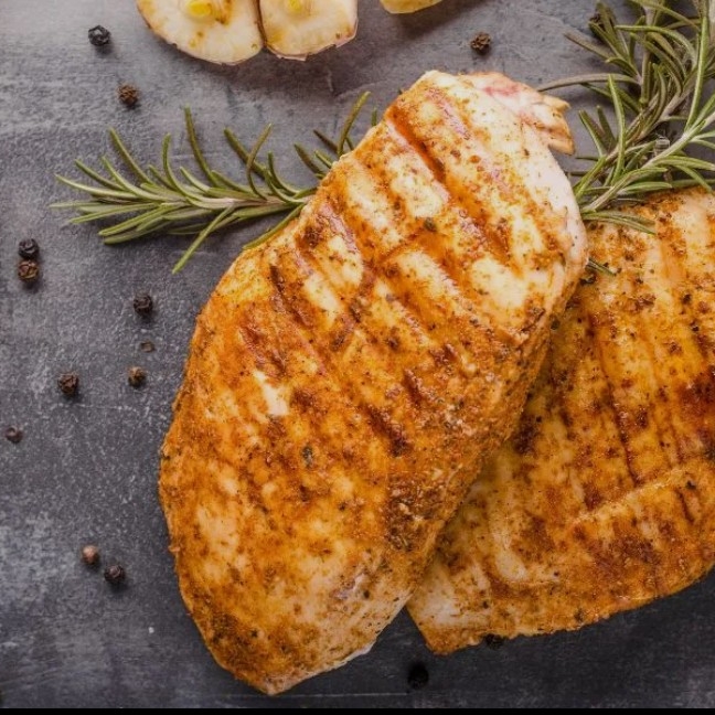 Filé de peito de Frango Grelhado, arroz, feijão, macarrão, farofa e mais um (complemento