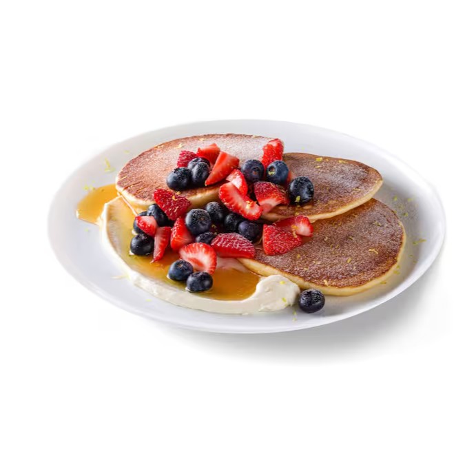 Panquecas americanas com creme de ricota doce, frutas da estação e finalizadas com mel. Paraíso na Terra.
