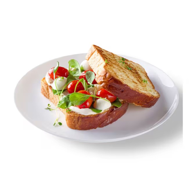 Sanduíche em pão brioche com mozzarela de búfala, tomate confit e rúcula. Cada mordida um sorriso.