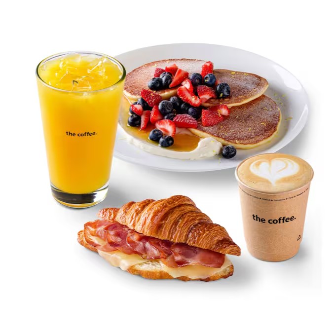 Suco de laranja + Bebida quente (Americano ou True White) +Croissant de Muçarela e Copa + Panquecas.