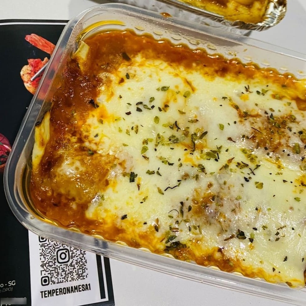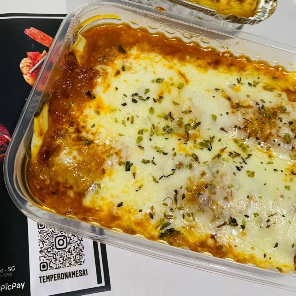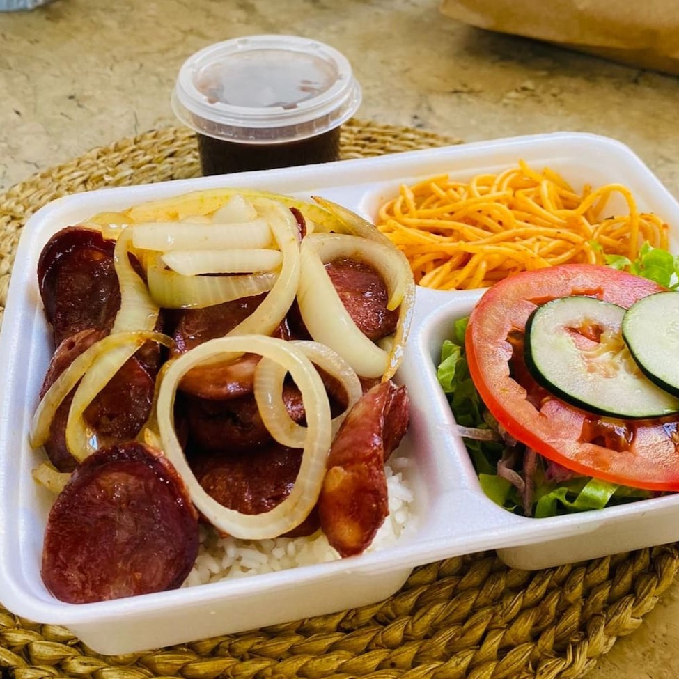 Quentinha de 700ml com acompanhamentos de sua preferencia e calabresa acebolada