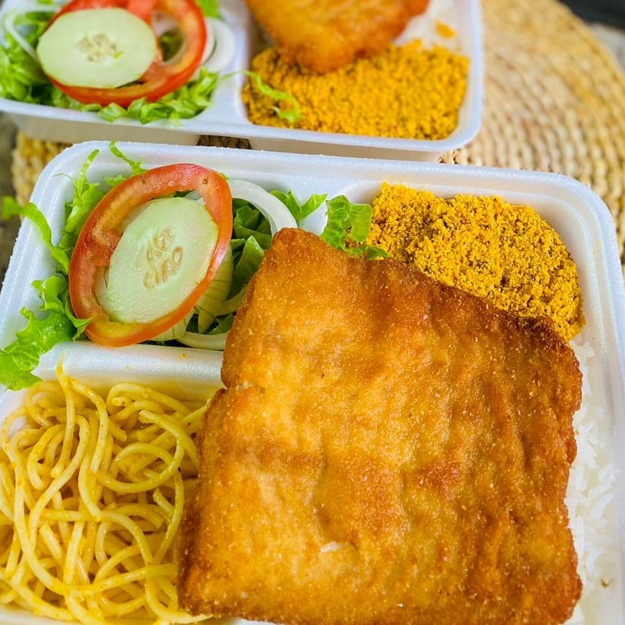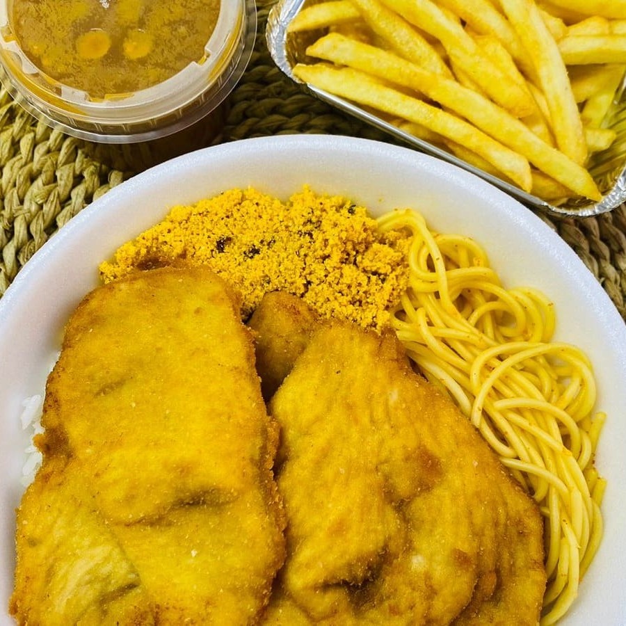 2 pratos maravilhosos de filé de peixe empanado com arroz, feijao, macarrão, farofa e salada.