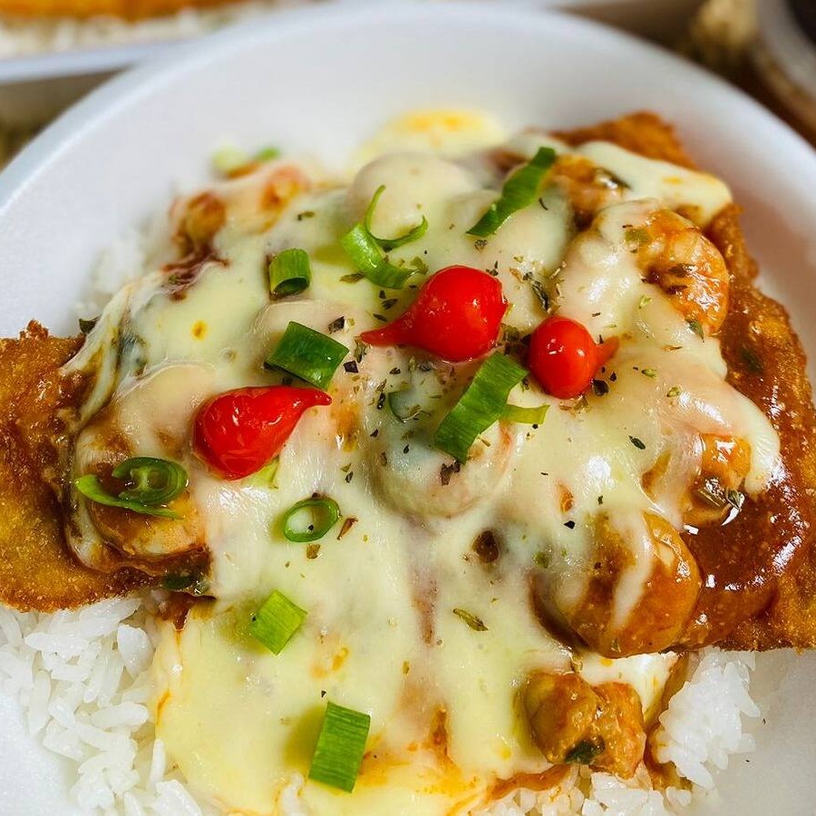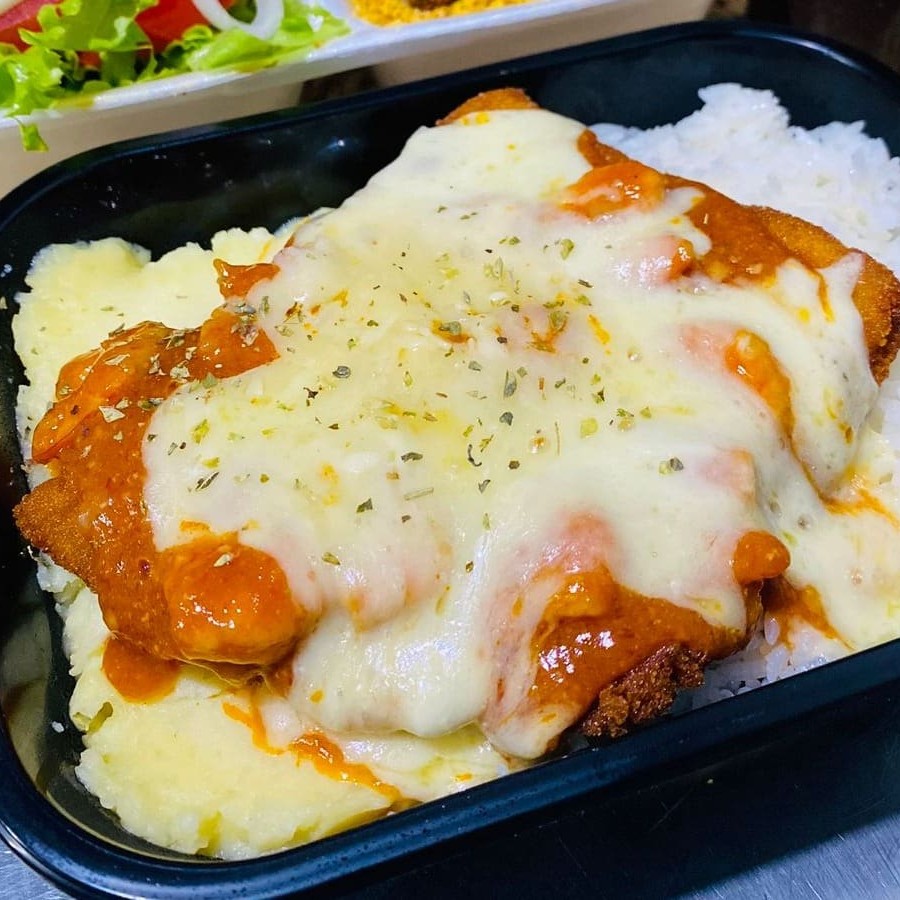 Delicioso Filé de peixe molho de camarao a parmegiana na piscina de Purê de batata com arroz, feijão e salada. ( vasilha de isopor 750ml )