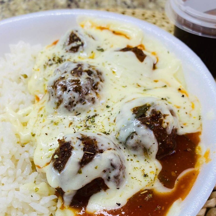 Maravilhosa almondega na piscina de pure com mussarela e acompanhado de feijao!