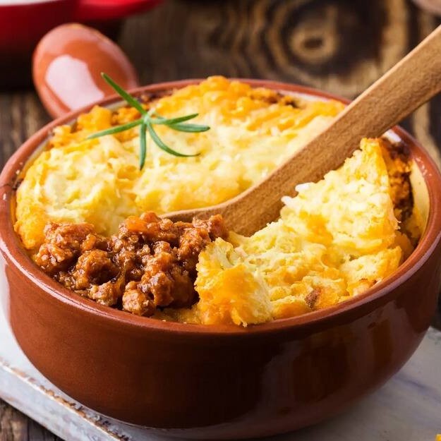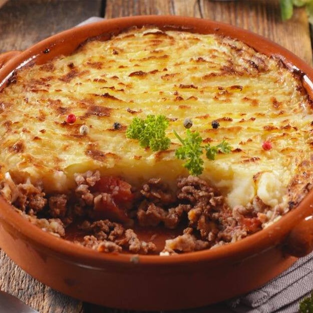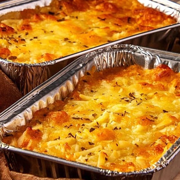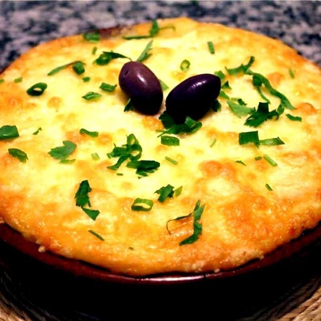 Purê de aipim, com recheio de carne moida, mussarela, presunto, ovos e azeitona, requeijão gratinado.