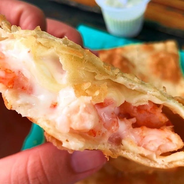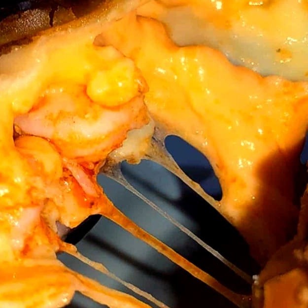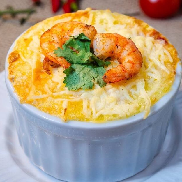 Pedaços de camarão ao creme e Cheddar! Uma combinação cremosa e irresistível.