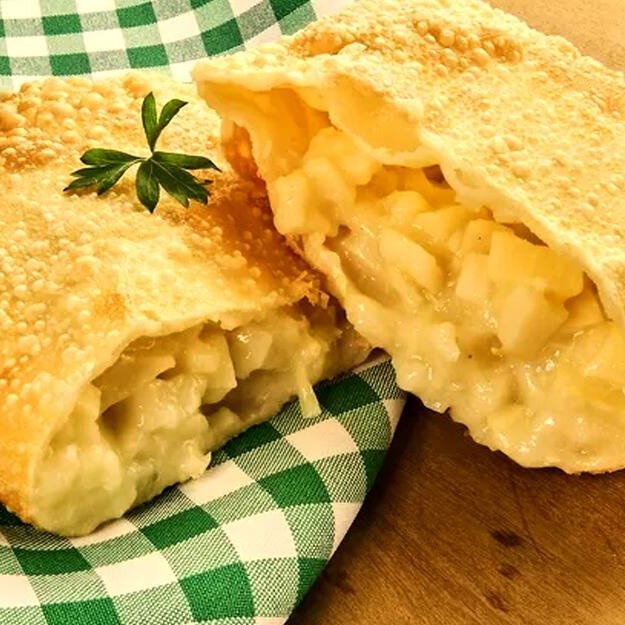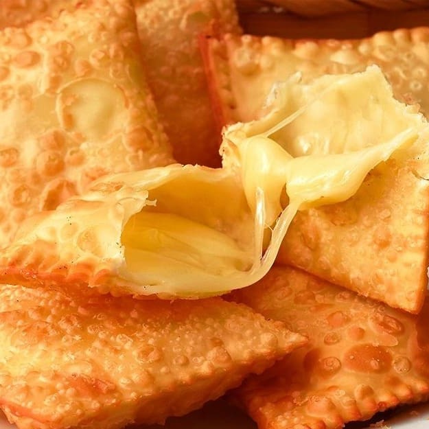 Pastel recheado com frango desfiado, palmito e requeijão cremoso! Uma combinação leve e saborosa que vai conquistar seu paladar.