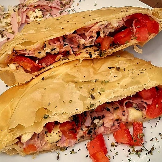 Pastel recheado com queijo minas, peito de peru, tomate fresco, azeitona e um toque de orégano! Leve, saboroso e irresistível.