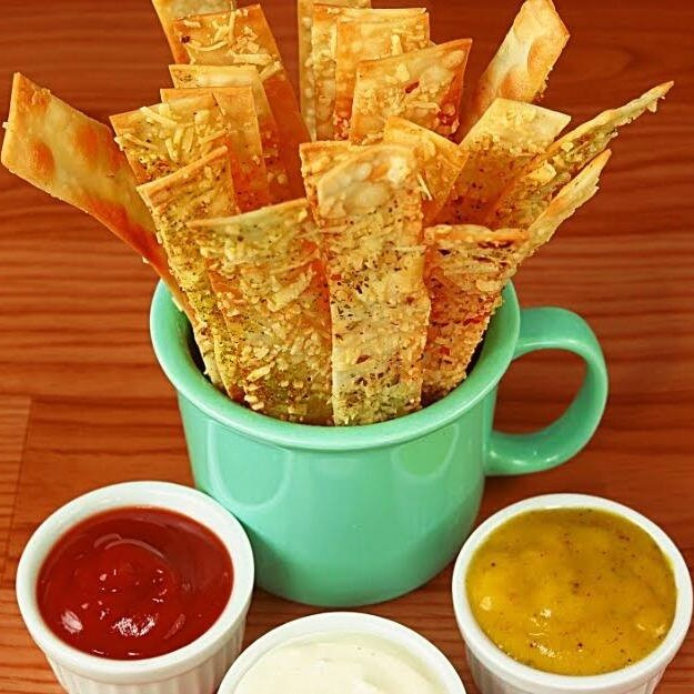 Tiras de massa de pastel frita, salpicada com parmesão e oregano. É de dar água na boca!