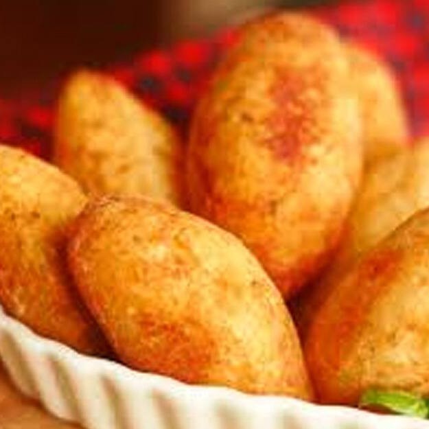 Purê de aipim, com recheio de pedaços de camarão ao creme, coberto com requeijão, parmesão, gratinado.