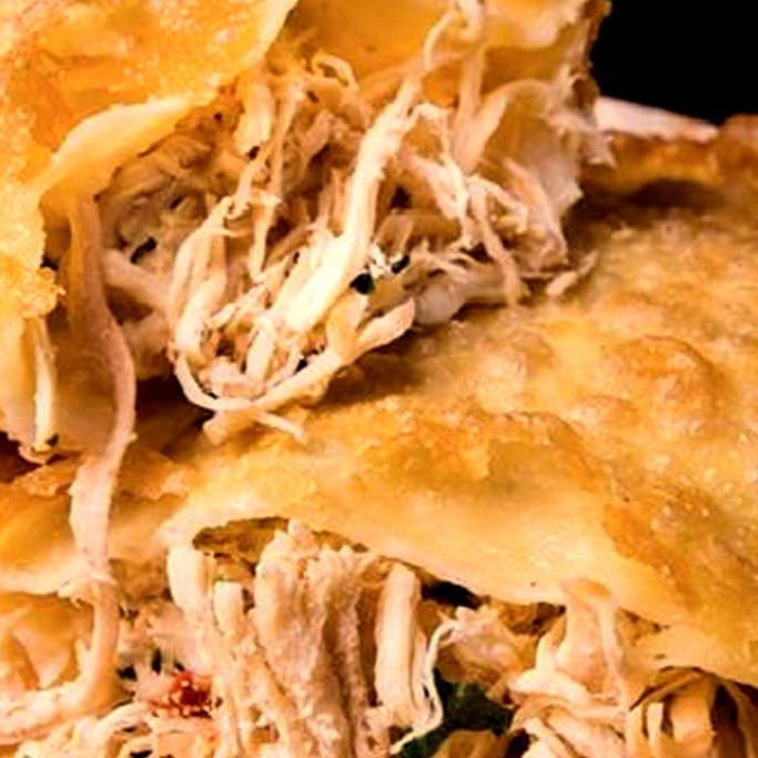 O clássico que nunca sai de moda: pastel de frango bem recheado, crocante e saboroso. Simplesmente irresistível!