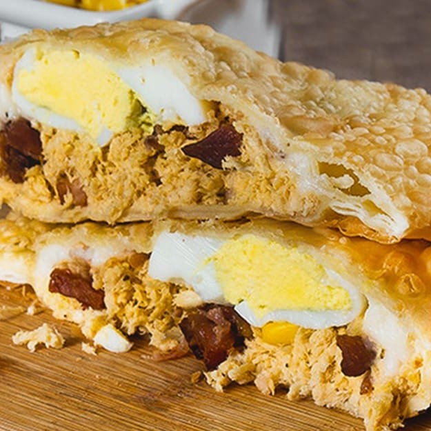Pastel recheado com frango desfiado e ovos cozidos! Uma combinação simples, mas cheia de sabor, perfeita para qualquer momento.