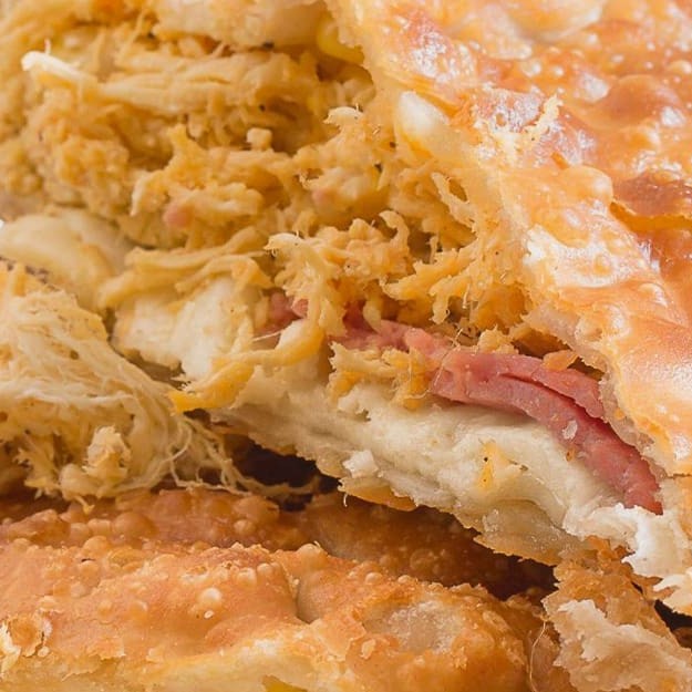 Pastel recheado com frango desfiado, presunto e cheddar cremoso! Uma mistura de sabores que vai surpreender seu paladar.