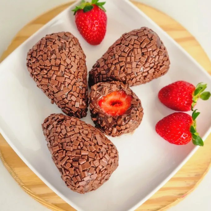 Feita com brigadeiro gourmet de cacau 50%, recheada com morango fresco e finalizada com granulados de chocolate. Uma combinação perfeita entre o doce e o azedinho da fruta.