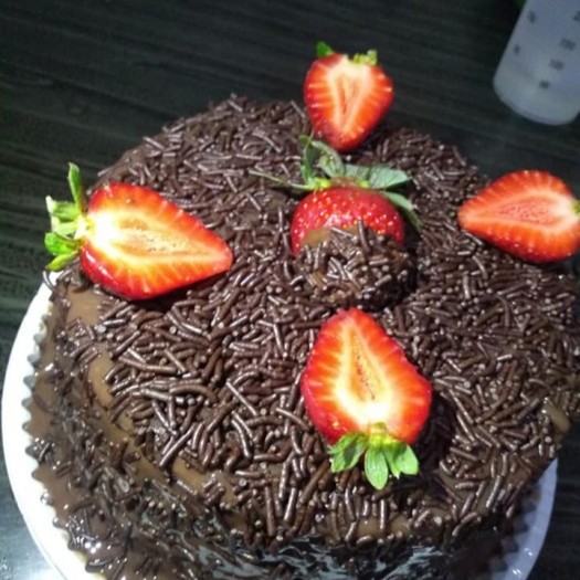 Massa fofinha e molhadinha, recheio de brigadeiro gourmet feito com cacau 50%, finalizado com morangos