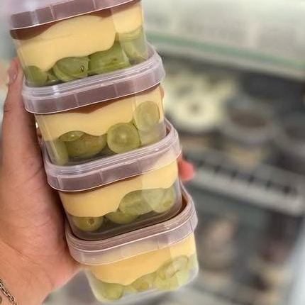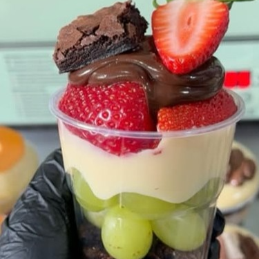 Uma explosão de sabores: Camadas do nosso delicioso brigadeiro, brownie crocante, uvas Thompson, brigadeiro de Ninho e morangos.