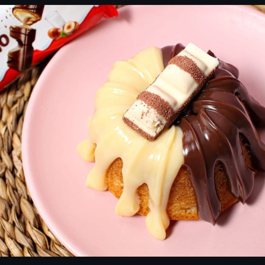 Nosso Bolo Vulcão caseiro é composto por uma massa branca amanteigada, bem molhadinho, no centro do um recheio bem cremoso de brigadeiro branco com brigadeiro artesanal chocolatudo. Finalizado com os dois Recheios e Bombom Kinder Bueno.