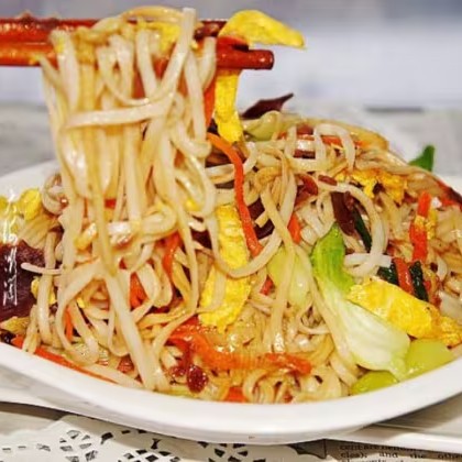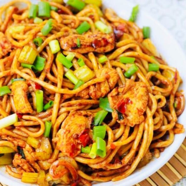 Macarrão espaguete,frango, cebola, cebolinha, cenoura, repolho, couve-flore molho de shoyu
