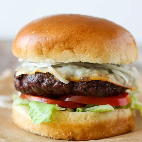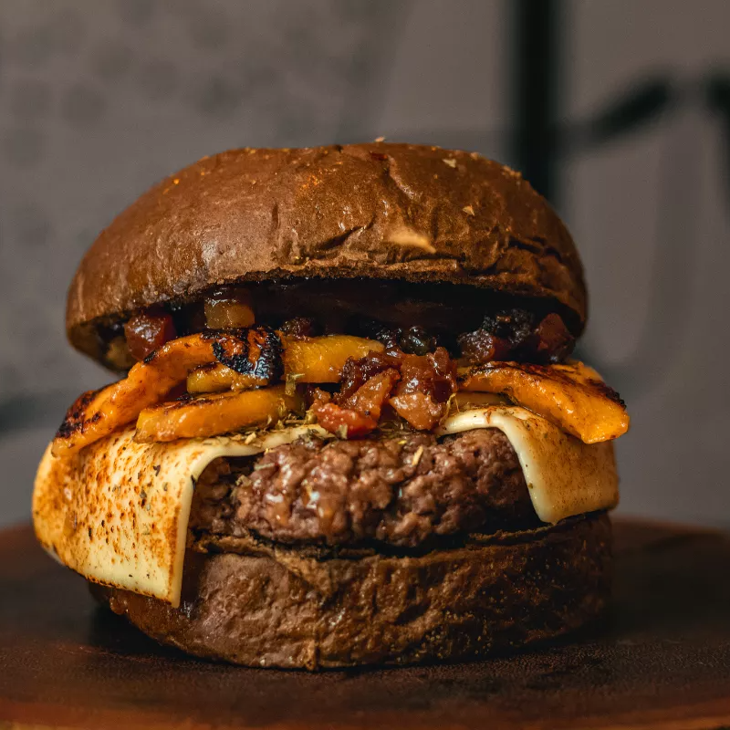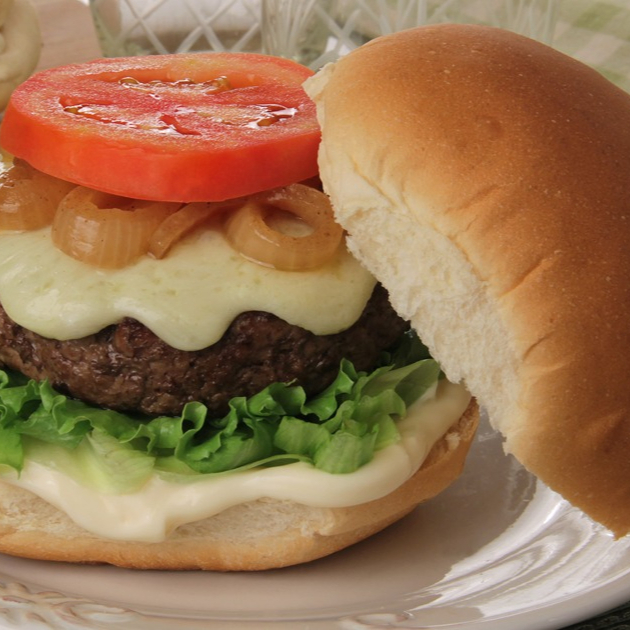 PÃO DE BRIOCHE BLEND DE 160G QUEIJO MUSSARELA GRATINADA BAEBECUE ANEL DE CEBOLA E MAIONESE ARTESANAL