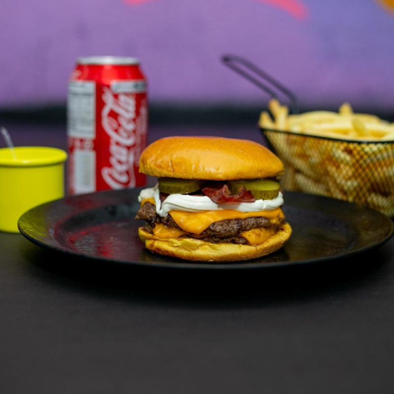 1 carne suculenta, queijo e presunto, ovo, cheddar cremoso, bacon, molho especial e salada + Batata frita P + Coca lata