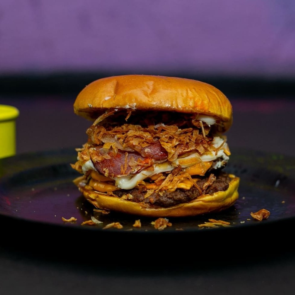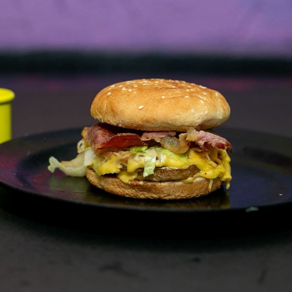 Pão brioche, blend de carne 90g , cheddar cremoso, bacon fatiado e cebola caramelizada.