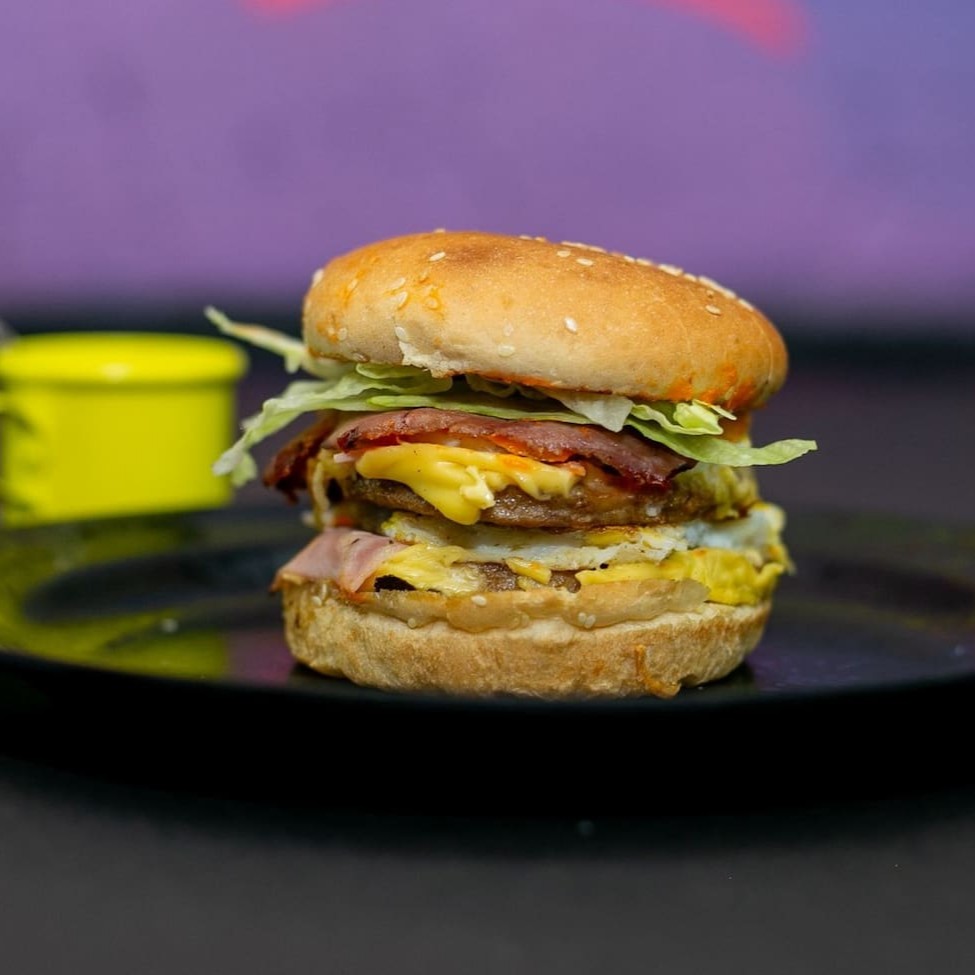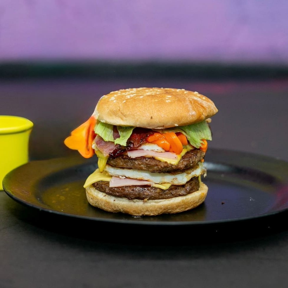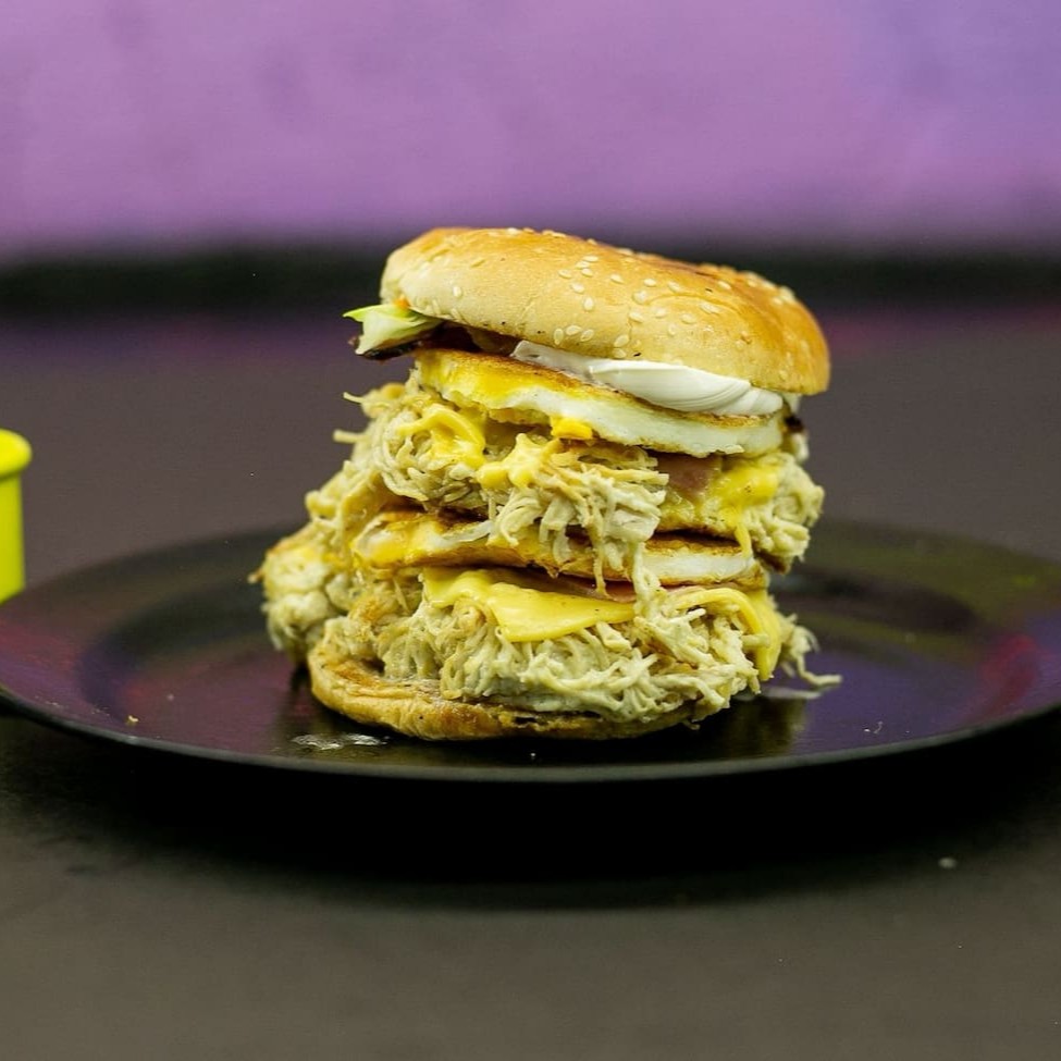 Pão, 2x carnes suculentas, 2x queijos, 2x presuntos, 2x ovos, cheddar, bacon e salada