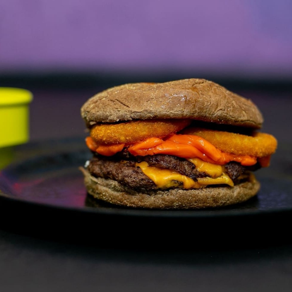 Pão brioche, blend de carne 90g , cheddar, 3 anéis de cebola e cebola caramelizada.