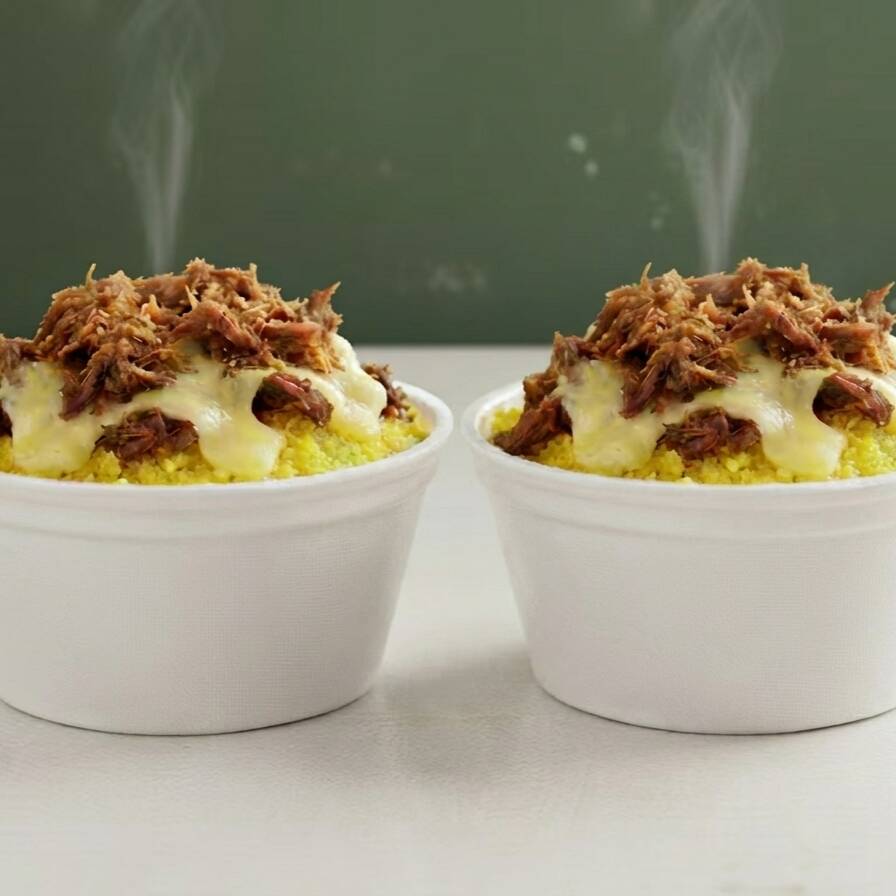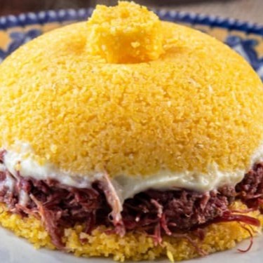 Cuscuz macio e quentinho, recheado com carne seca desfiada e queijo derretido, finalizado com aquele toque especial de manteiga que deixa tudo ainda mais gostoso. Um prato cheio de sabor e tradição pra você se deliciar.