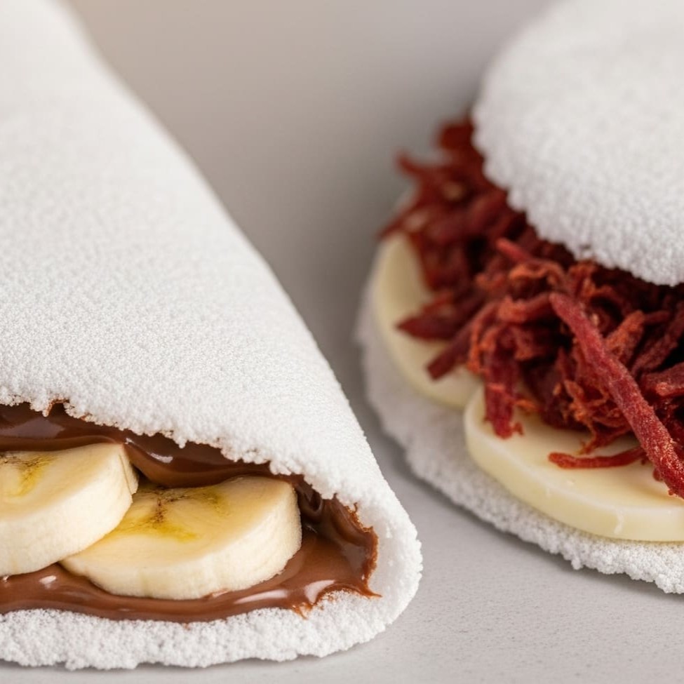 Comece com uma tapioca recheada de carne seca desfiada com queijo derretido, douradinha na manteiga e super saborosa. Depois, se joga na doçura com a clássica banana com Nutella — cremosa, marcante e irresistível. Um combo completo pra quem ama comer bem!