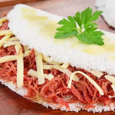 Carne seca desfiada suculenta refogada na manteiga, combinada com queijinho derretido, finalizada com um toque suave de manteiga na massa da tapioca. Uma tapioca recheada para quem não abre mão de uma boa refeição.