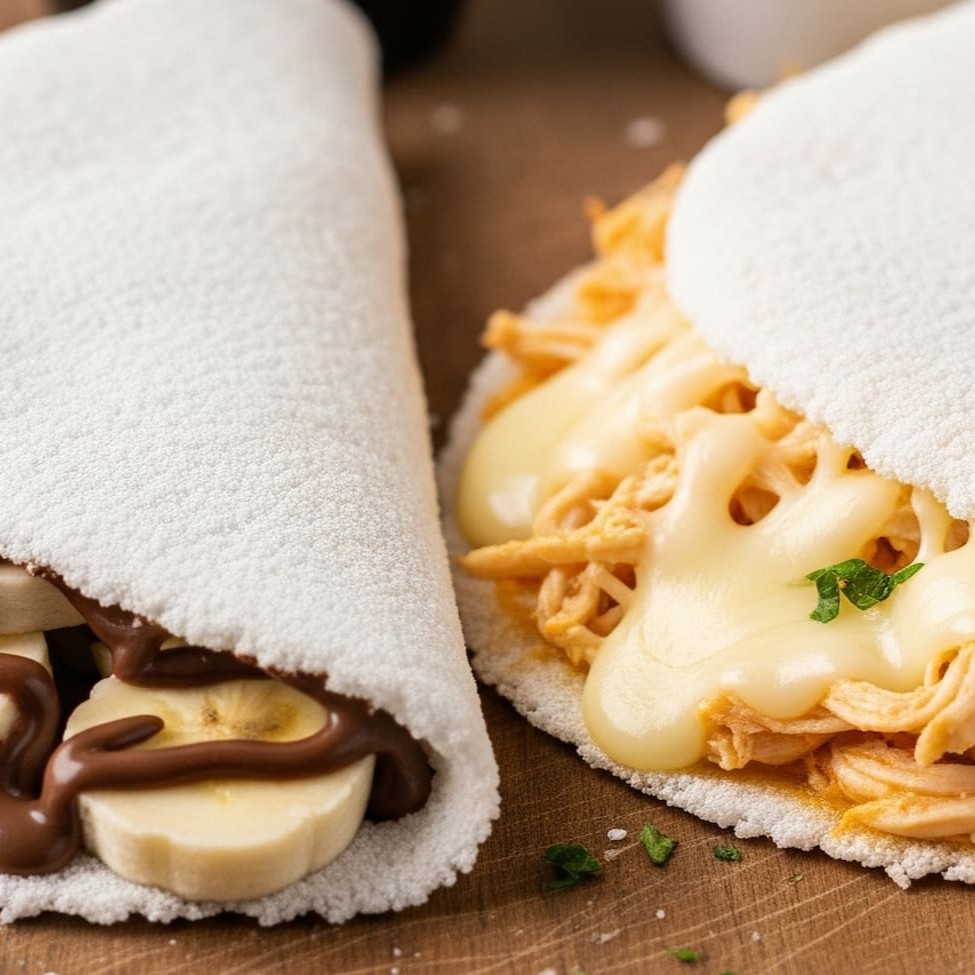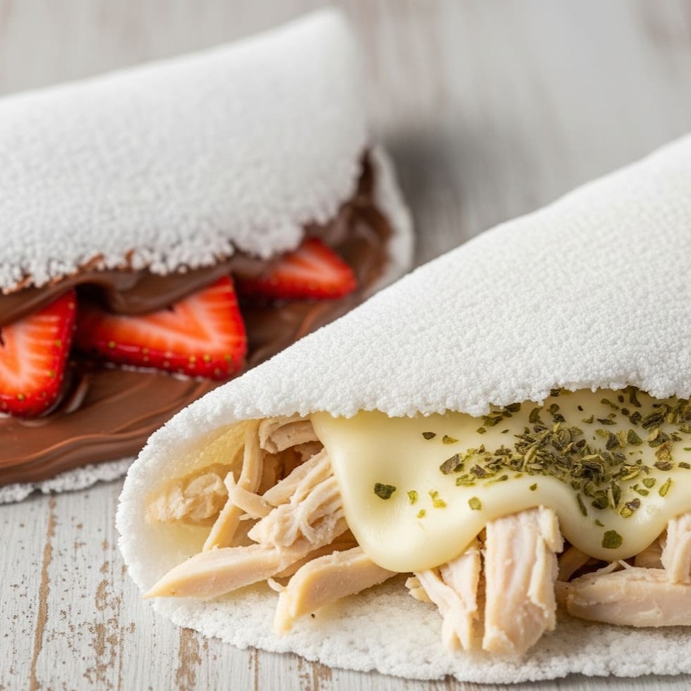 Uma combinação que agrada em cheio! Comece com a tapioca salgada, recheada com frango desfiado, queijo derretido, manteiga na chapa e um toque de orégano pra dar aquele sabor especial. Depois, se joga na doçura com morangos frescos e Nutella — cremosa, marcante e irresistível. Um combo completo pra quem curte equilíbrio entre o salgado e o doce!