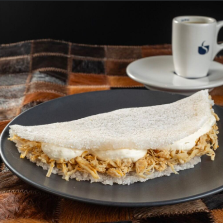 Tapioca de franguinho desfiado e refogado com um requeijão cremoso que derrete sobre o frango, finalizado com um pitada de orégano.