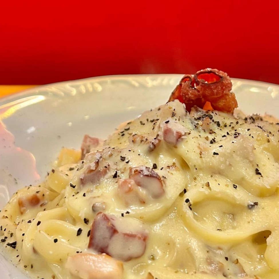 Massa artesanal com parma, rúcula e parmesão em lascas