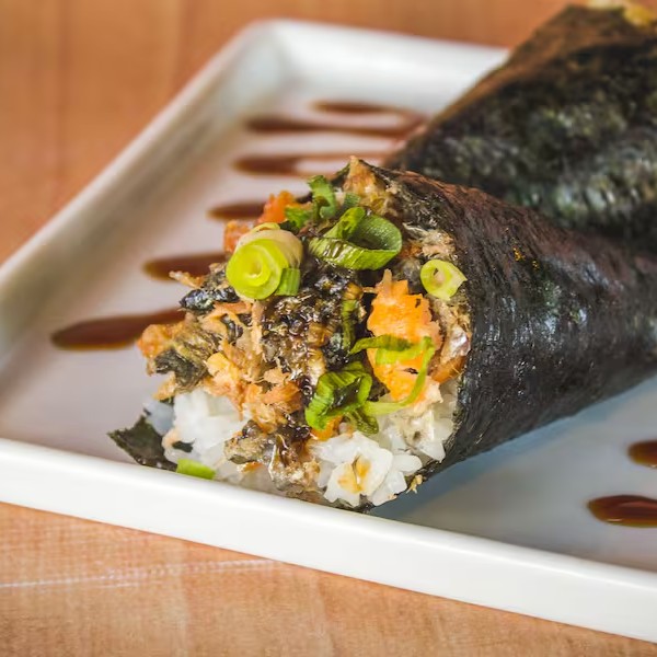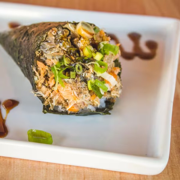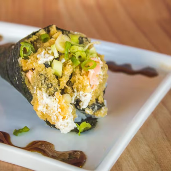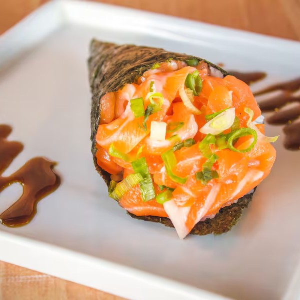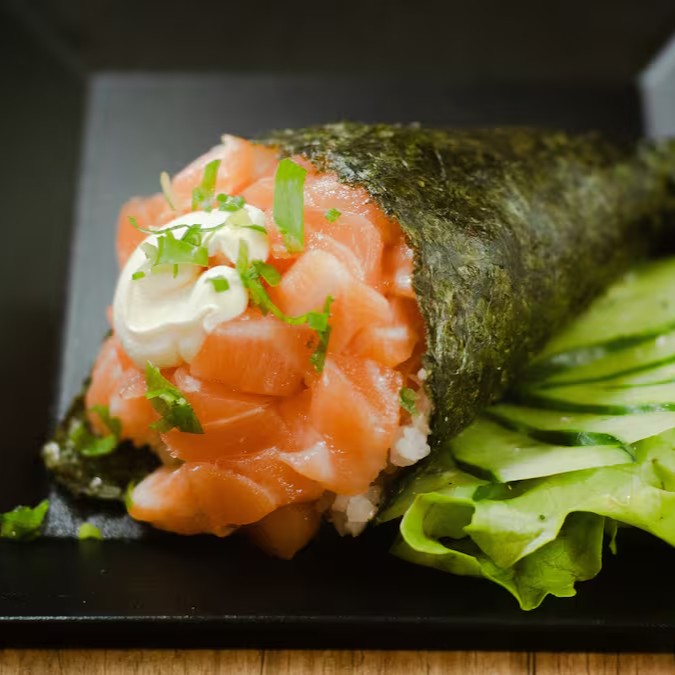 Temaki de salmão fresco com arroz japonês, cream cheese e gergelim