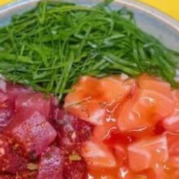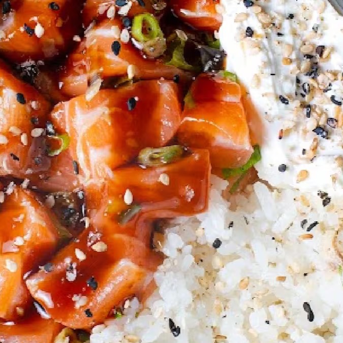 Porção misto em cubos salmão e atum com teryaki e cebolinha