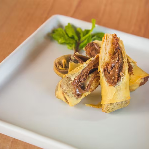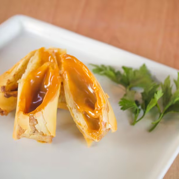 Massa do harumaki, alho poró, hondashi, ajinomoto, frango e cream cheese.