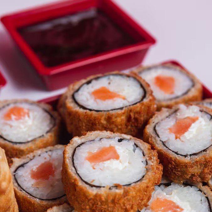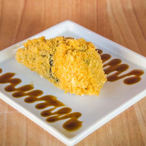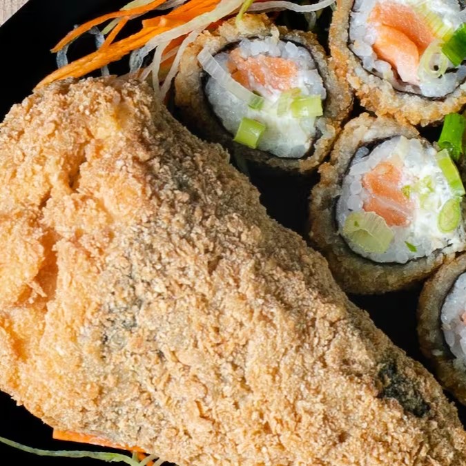 Recheado de salmão, arroz japonês e cream cheese, coberto farinha panko e frito