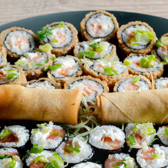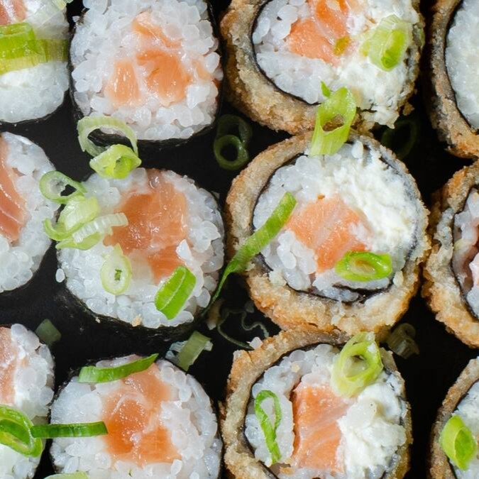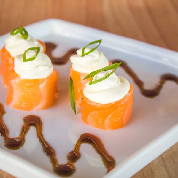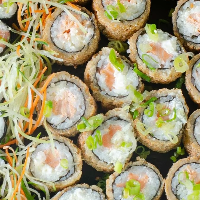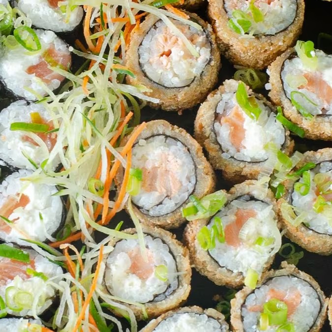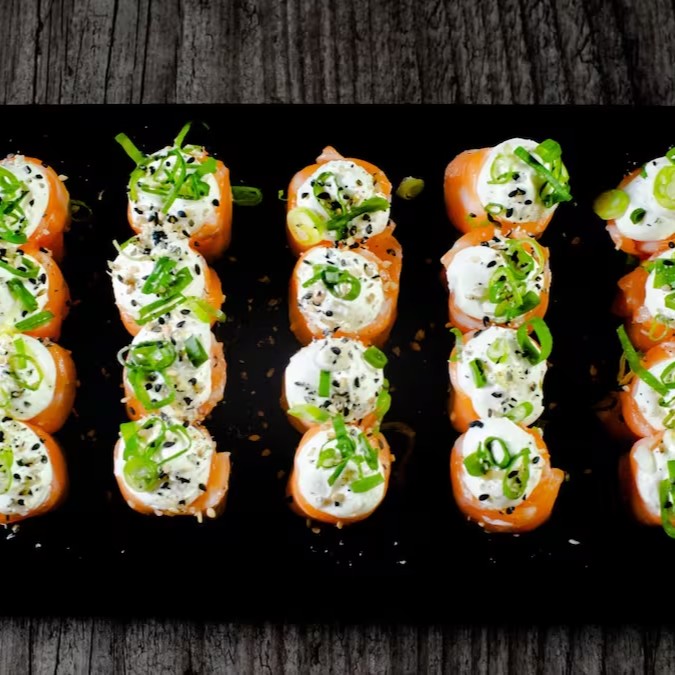 Arroz temperado, salmão, cream cheese, cebolinha e gergelim.