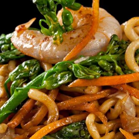 Delicioso yakisoba com pedaços de camarão grelhado, legumes refogados e molho especial da casa. Escolha o tamanho :d