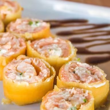 Massa do harumaki, alho poró, hondashi, ajinomoto, salmão e cream cheese.