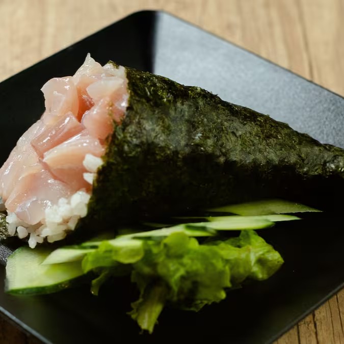 Alga nori, arroz temperado e pele de salmão grelhada.