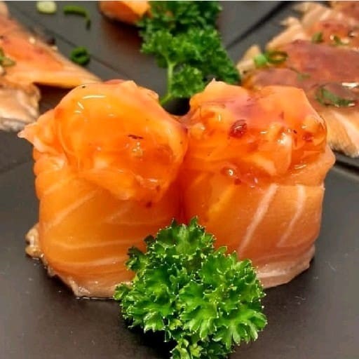 Massa de harumaki com recheio de salmão, creme cheese e cebolinha. Acompanha molho agridoce.