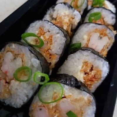 Recheio de pele de salmão grelhada, creme cheese, cebolinha, enrolado com a nori/alga e empanado na panko.
