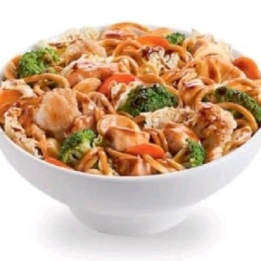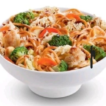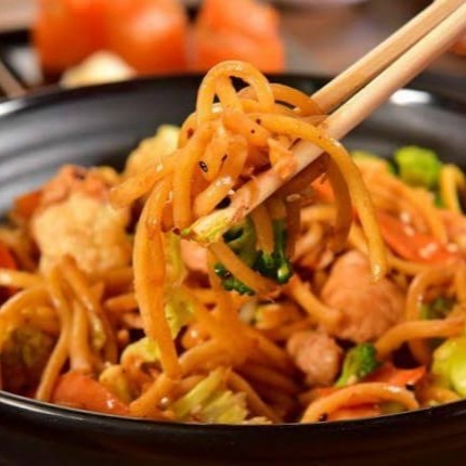 Macarrão, cebola refogada ao óleo de gergelim, cenoura, brócolis, repolho e proteína de frango.