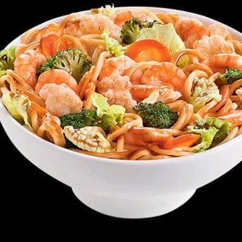 Macarrão, cebola refogada ao óleo de gergelim, cenoura, brócolis, repolho e camarão.