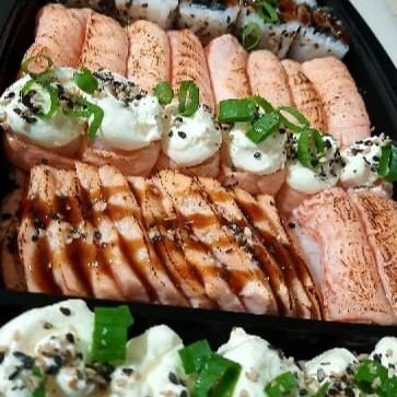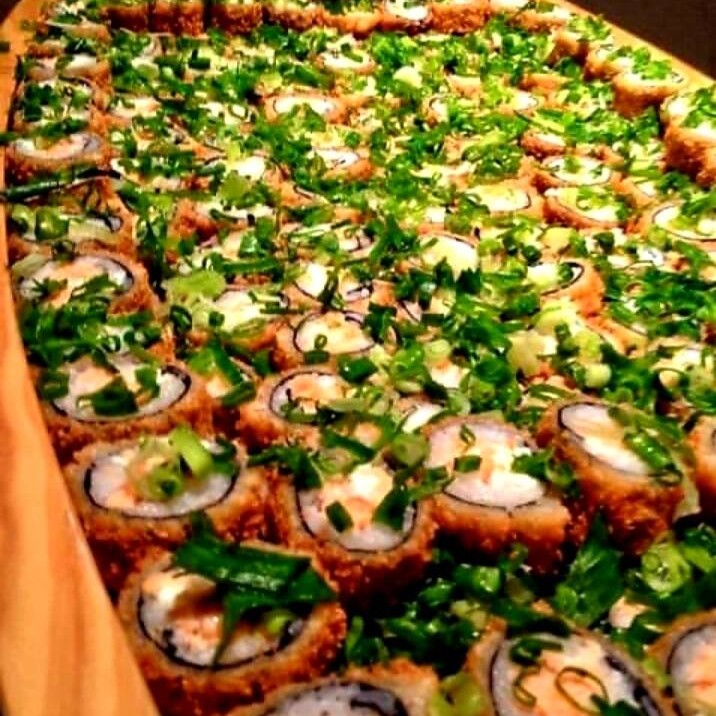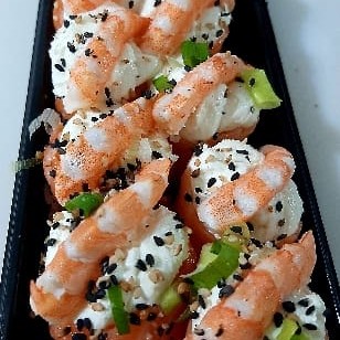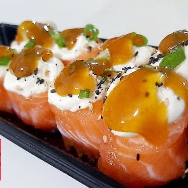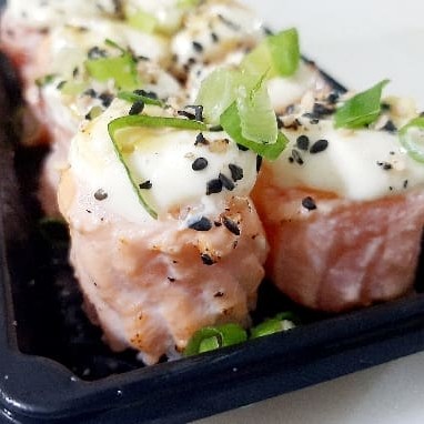 Porções de arroz enrolados no salmão com recheio de creme cheese, cebolinha e gergelim.